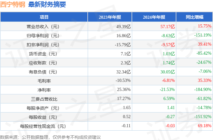 据证券之星公开数据整理,近期西宁特钢(600117)发布2024年年报。根据财报显示,西宁特钢增收不增利。截至本报告期末,公司营业总收入57.17亿元,同比上升15.75%,归母净利润-8.63亿元,同比下降151.19%。按单季度数据看,第四季度营业总收入16.01亿元,同比下降2.13%,第四季度归母净利润-4.61亿元,同比下降116.15%。